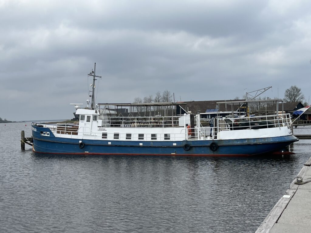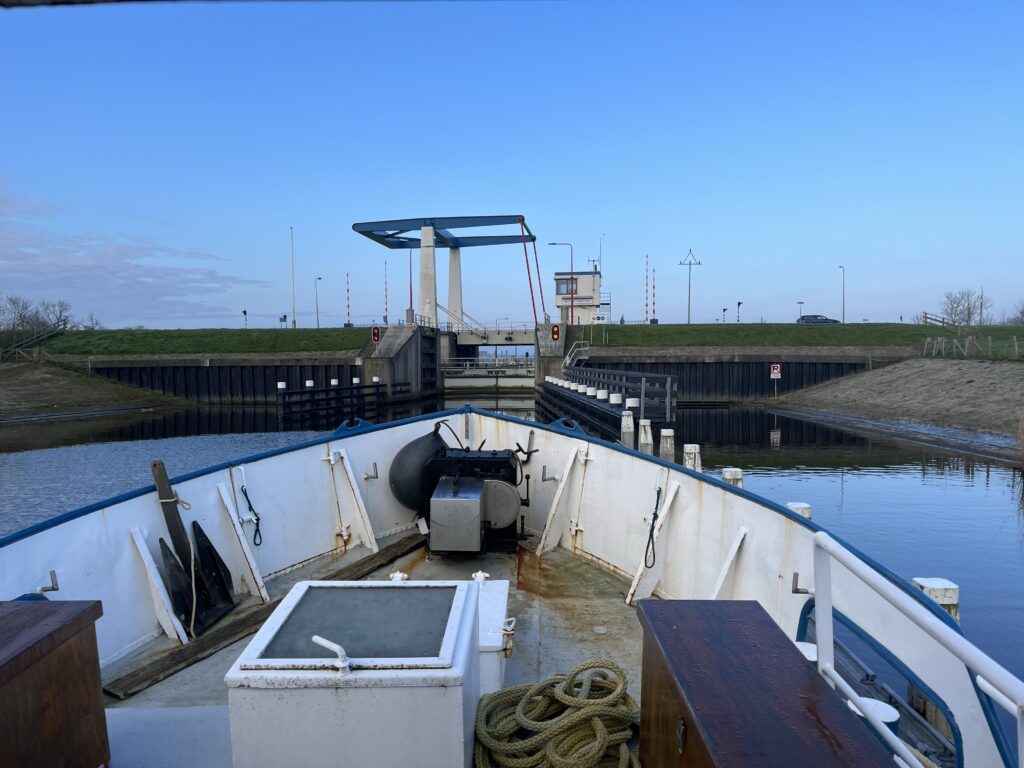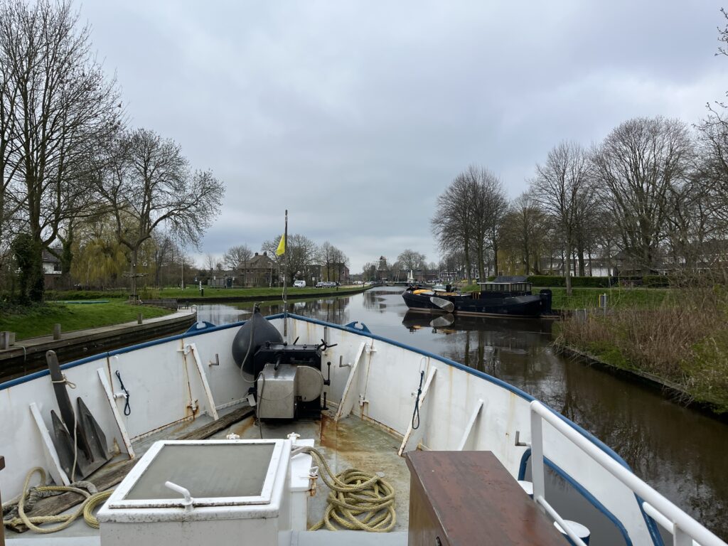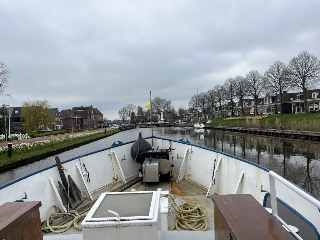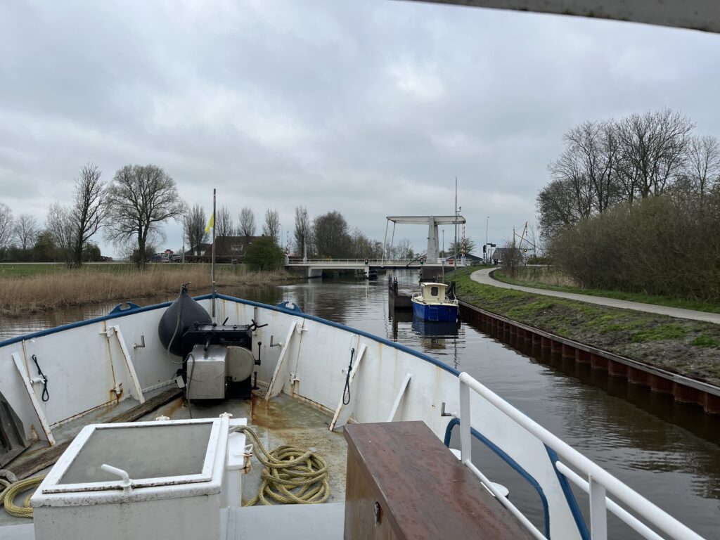 Vandaag was d-day! Onder de bezielende leiding van schipper George zijn we vanochtend om half acht met z’n vijven vertrokken uit Lauwersoog. Het doel was om om 9 uur bij de eerste brug te zijn om zo soepel alle volgende bruggen en sluizen te kunnen passeren. Vandaag was ook was mijn ‘praktijk examen’, waarbij George mij alles heeft verteld wat nodig was en ik heb vrijwel de hele route gevaren. Het was een prachtige vaar-dag dwars door Friesland en ik heb super veel geleerd. Maar…..morgen moet ik het zelf doen, want dan gaat George alweer naar huis. Tot nu toe gaat het wel goed, het lukt vast.