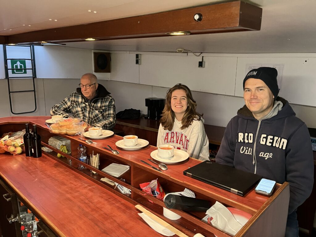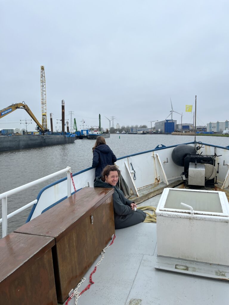 De volgende ochtend, na een heerlijke nacht in Amsterdam, kwamen Marjan, Gemma, Simon, Marylou, Veerle en Arne aan boord. Na een kopje koffie en bijpraten was het tijd om te vertrekken.