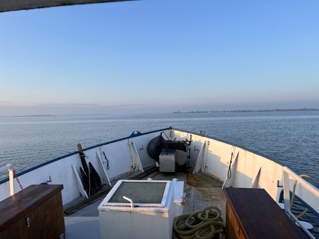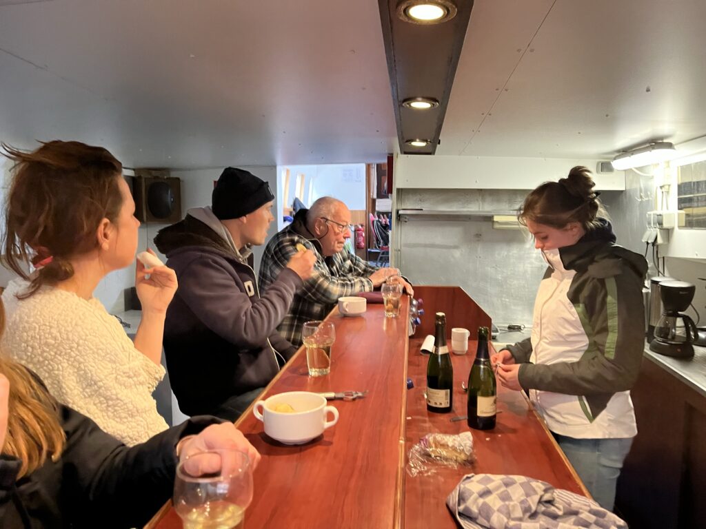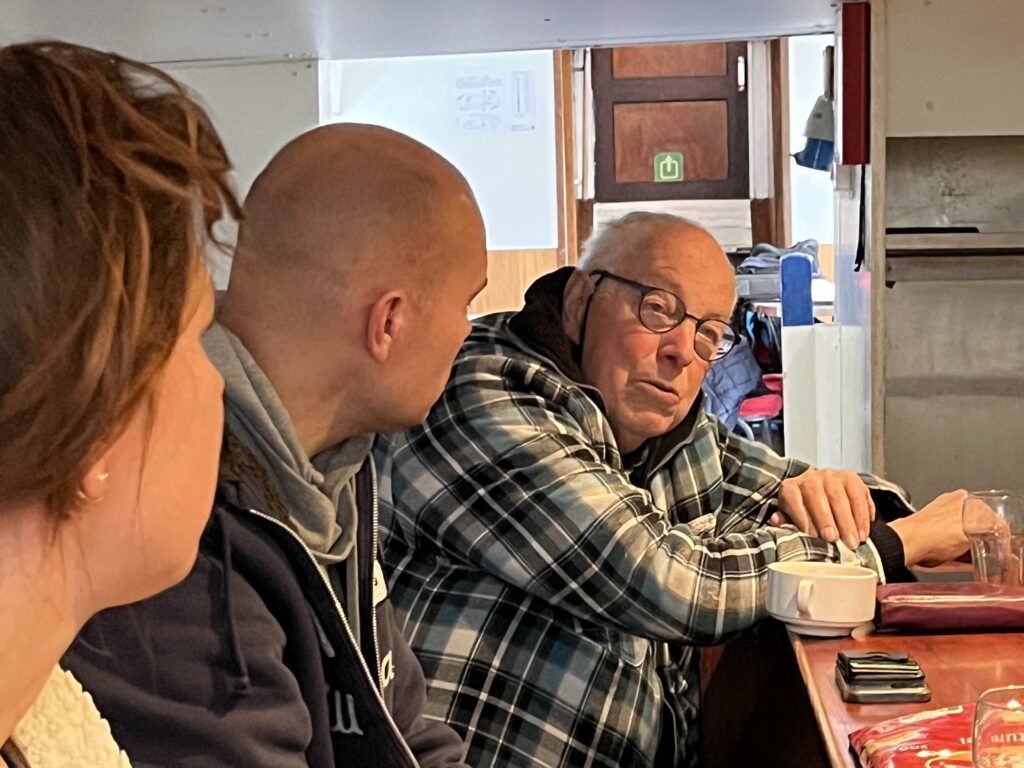 Schipper George wacht ons bij aankomst in de haven ‘het Booze wijf’ op en brengt de tassen alvast naar de boot. Jacco blijft bij de boot als George, Maria en ik naar het kantoor van de wadloop-stichting gaan voor de officiële overdracht van het schip. Het gebak staat al klaar als voorzitter Nico na een plechtig woordje de sleutels en een prachtig boek over de Waddenzee overhandigd.
